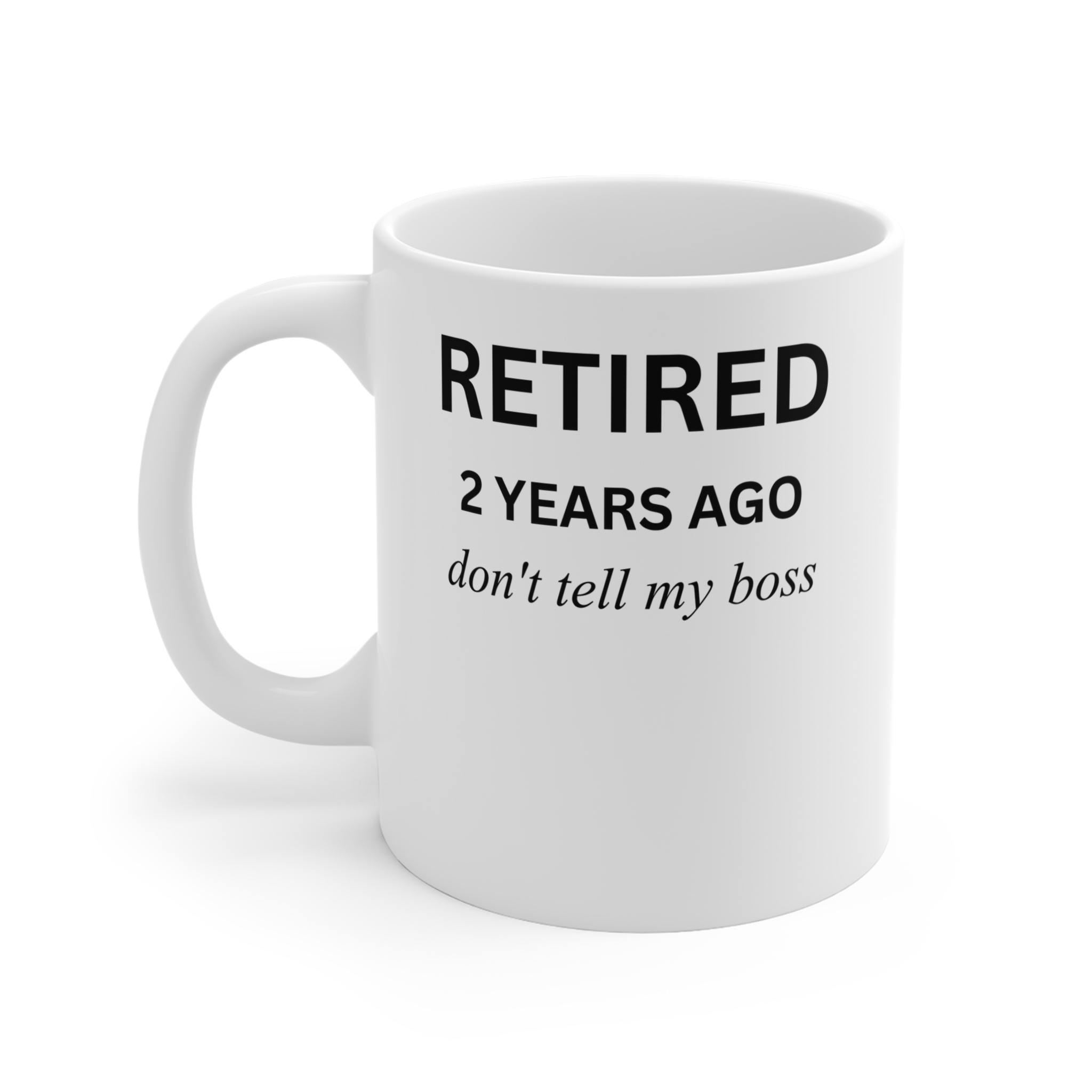 Classic 11oz ceramic mug featuring the cheeky line “Retired 2 Years Ago — Don’t Tell My Boss.” A perfect companion for morning coffee, quiet afternoons, or gifting to a retiree with a sense of humor.