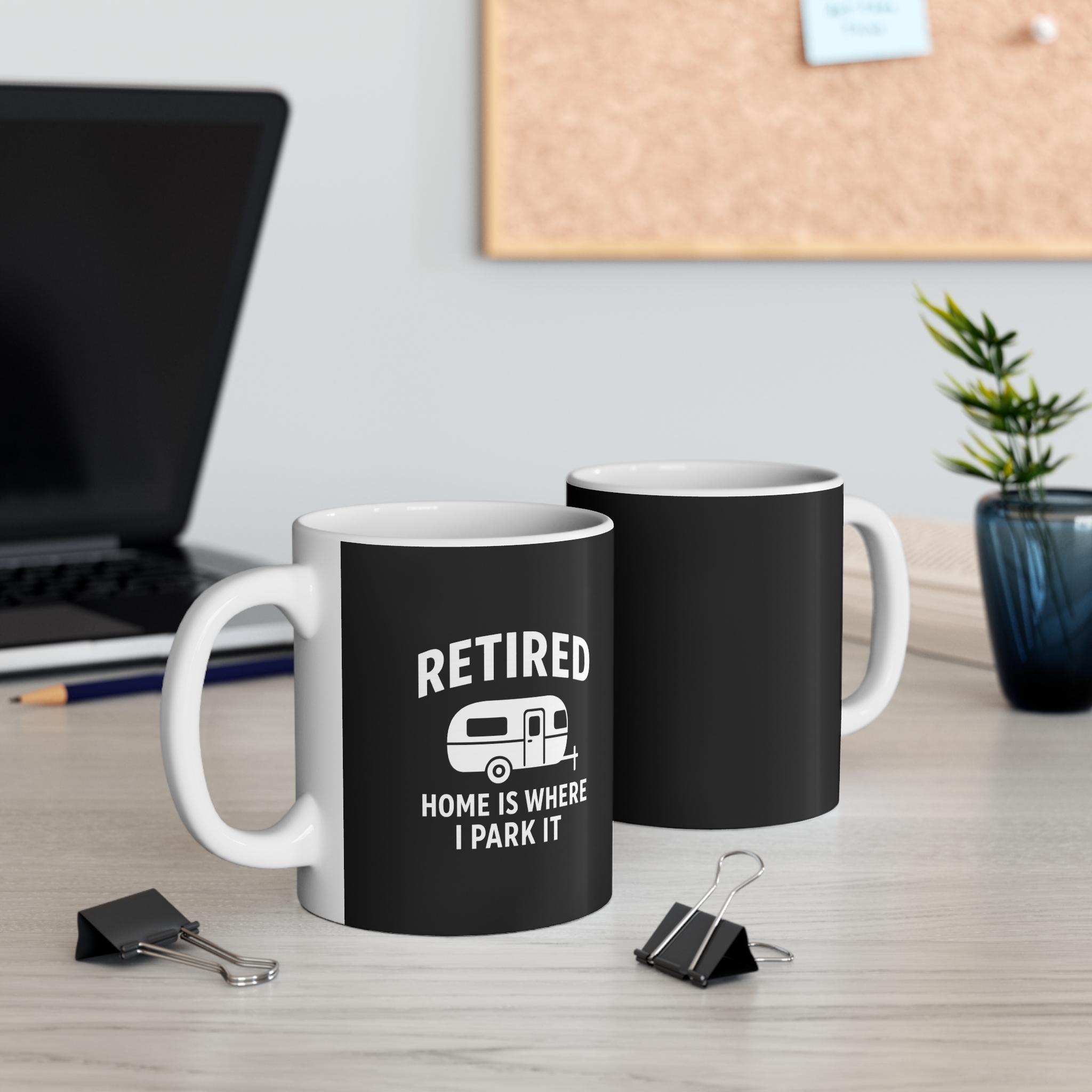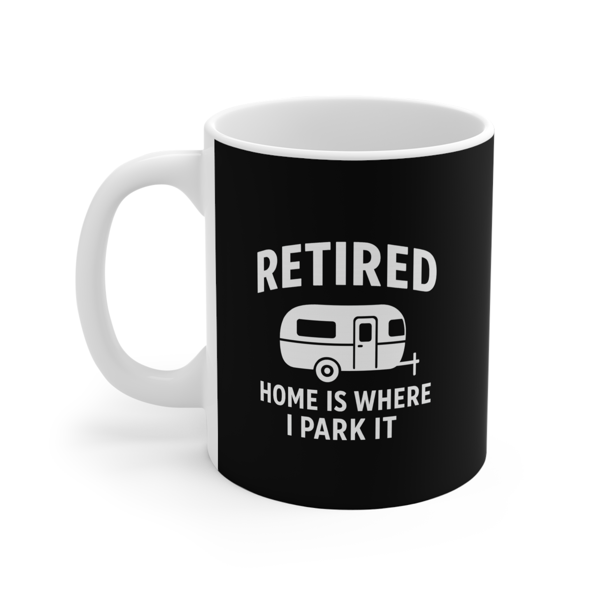 Start your day with a smile. This 11oz ceramic mug features a bold camper graphic and the phrase “Retired — Home Is Where I Park It.” Microwave- and dishwasher-safe, it’s the perfect retirement, RV, or camper-life gift.