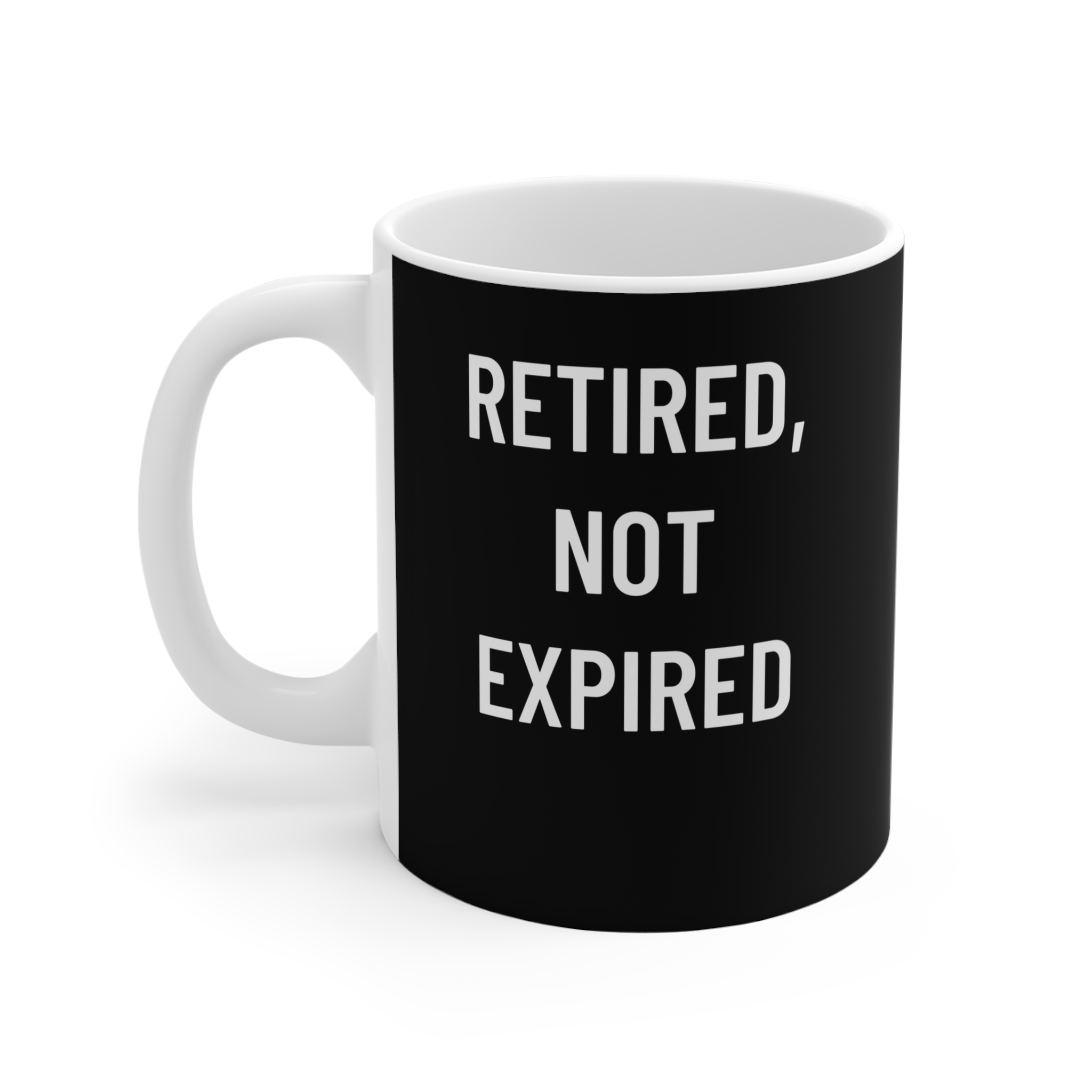 Enjoy your morning coffee with a laugh! The “Retired, Not Expired” black mug with white lettering is the perfect reminder that life after work is just getting started.
